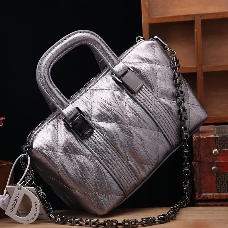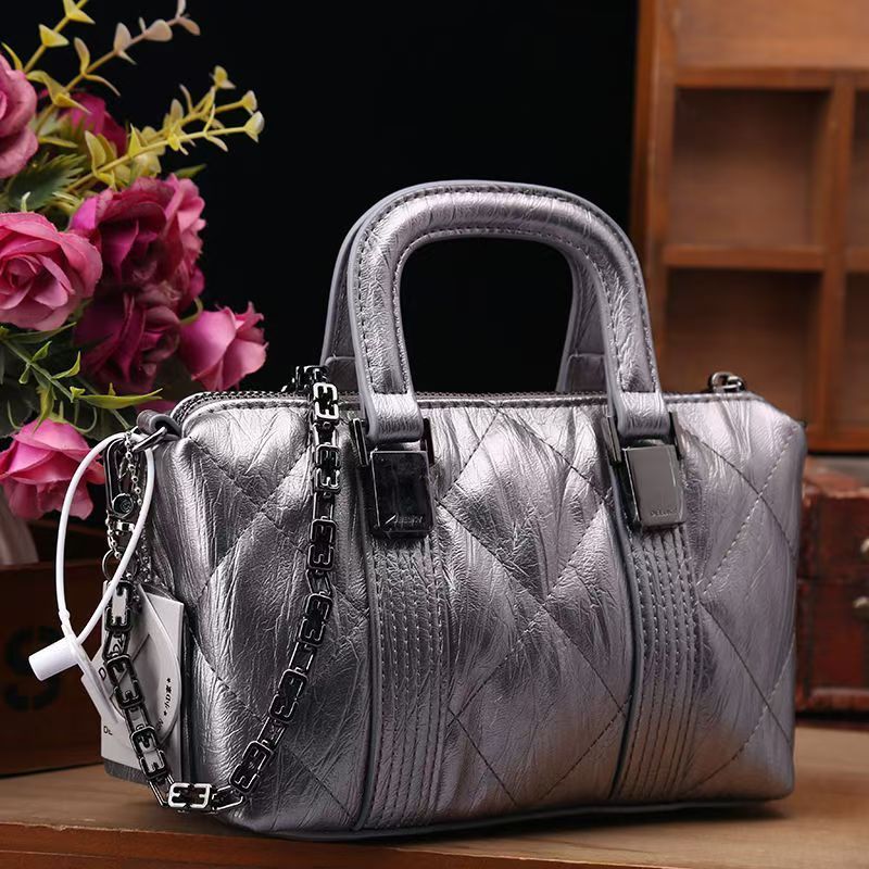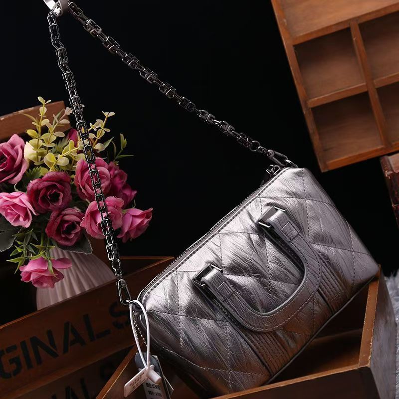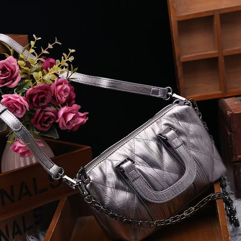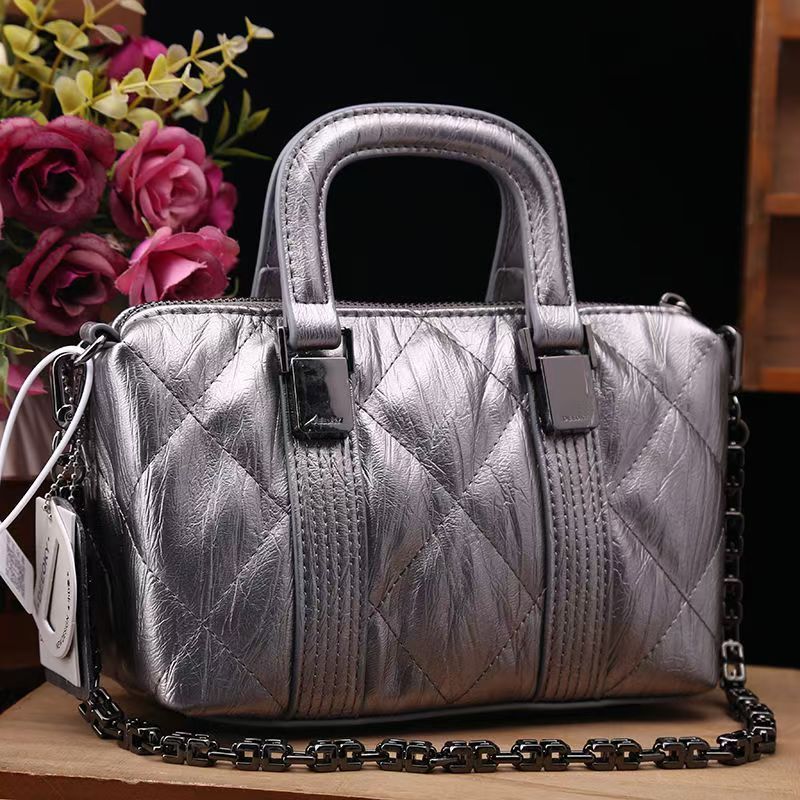 真皮休閑小香風手提女包2025新款時尚百搭菱格鏈條單肩斜挎包