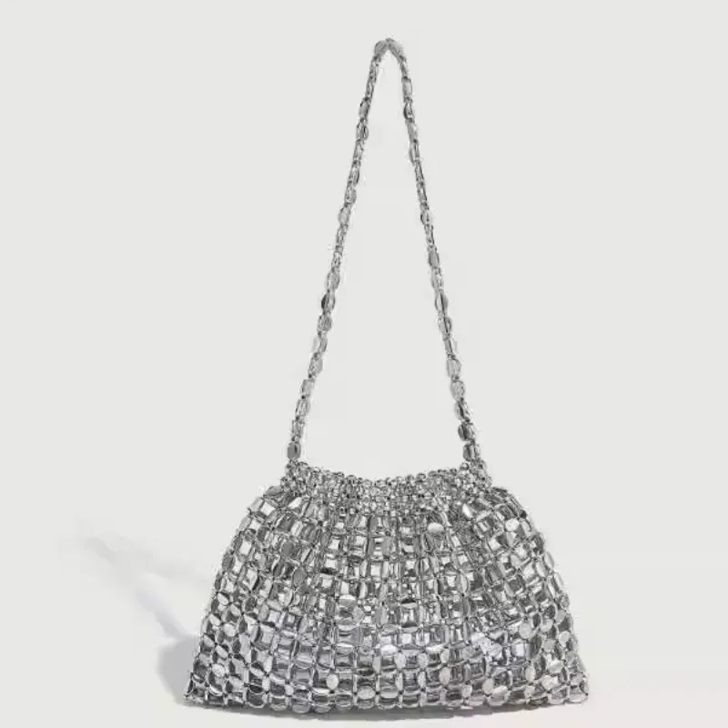 Y2KK手提小衆設計感銀色手工串珠編織手提包夏日B備腋下單肩包潮